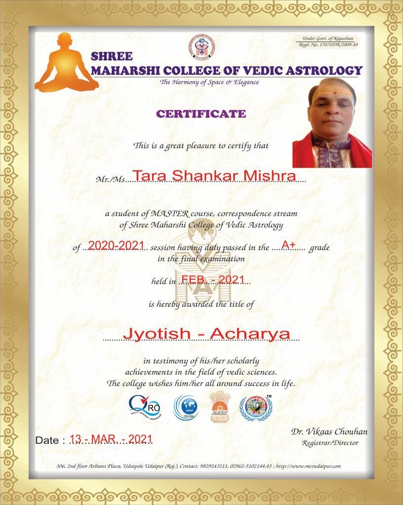 the esteemed titles of Acharya and Ph.D. from Rajasthan in 1998, and several other degree and awards including Ph.D gold medal from Maharshi college of vedic astrology , Udaipur